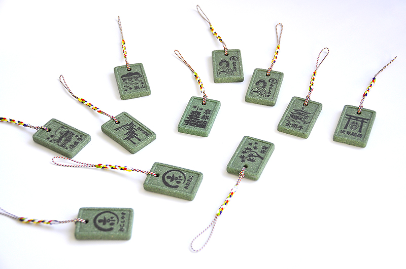 京都 抹茶根付 京都産の抹茶を使用した根付です。お茶を加工する際に出た茶埃を活用したサスティナブルな新しい京土産。京都市内周辺の観光地を使用したデザインでバリエーション豊かに仕上げました。 |
